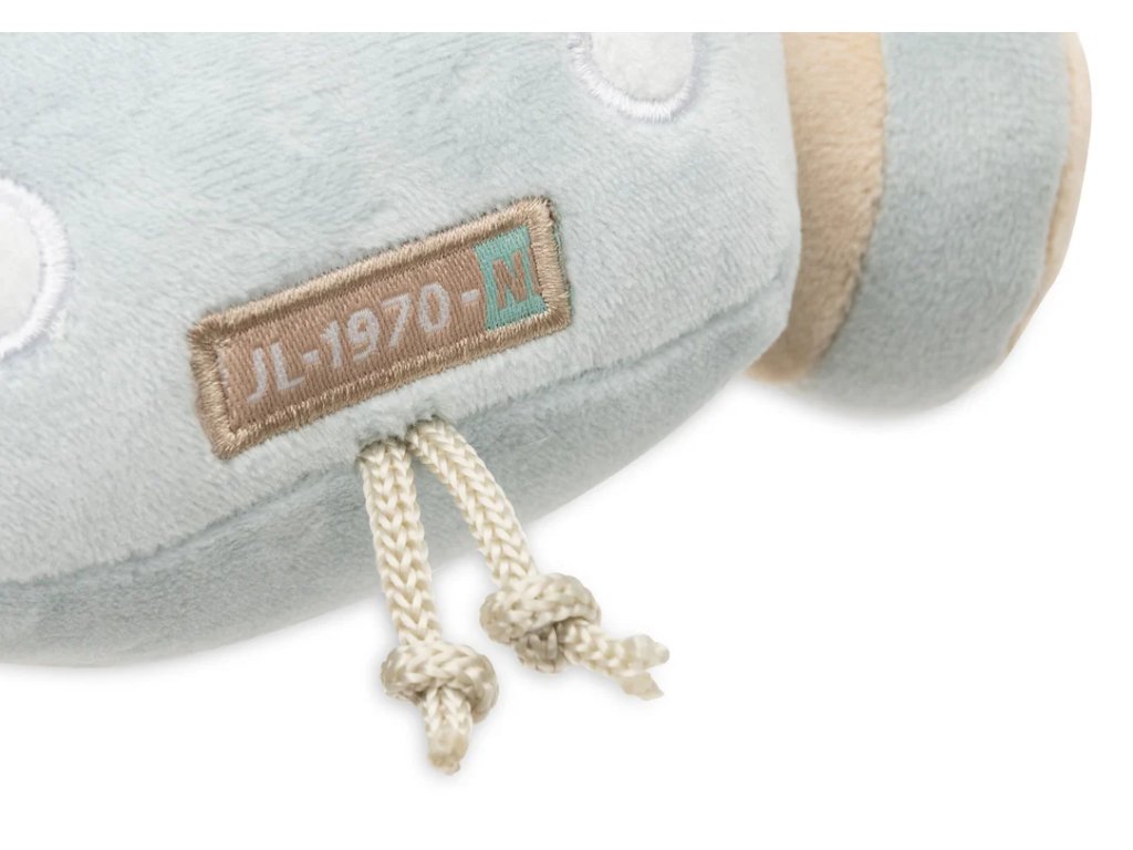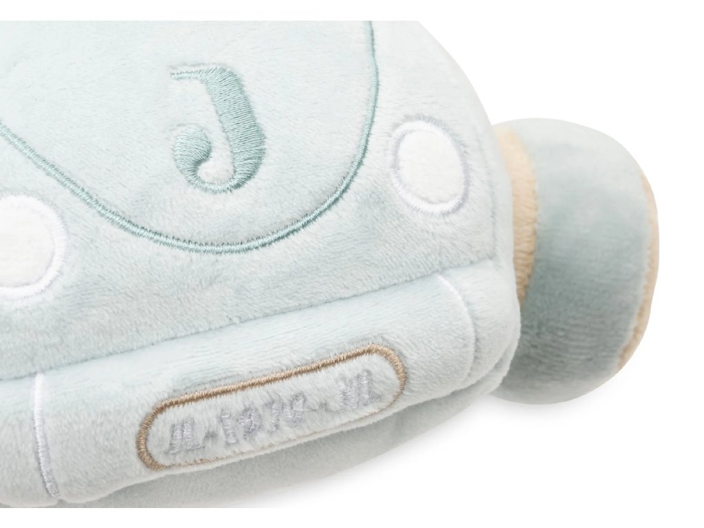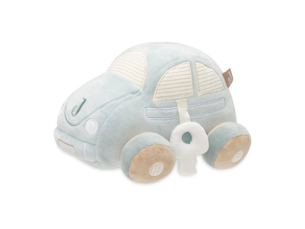 Mäkké plyšové autíčko v morskej zelenej farbe so zvončekom, praskajúcim kľúčom a šnúrkami pre senzorickú zábavu doma aj na cestách.