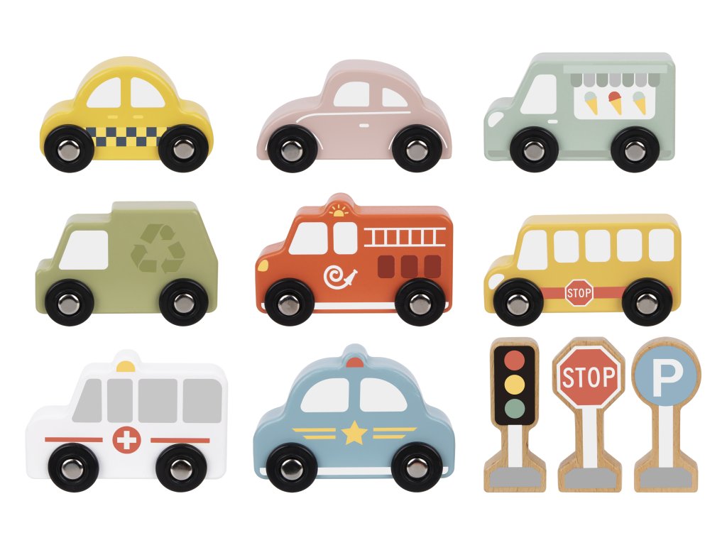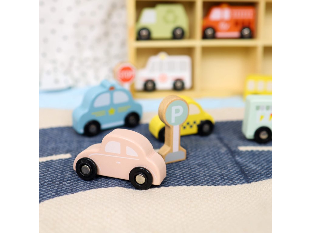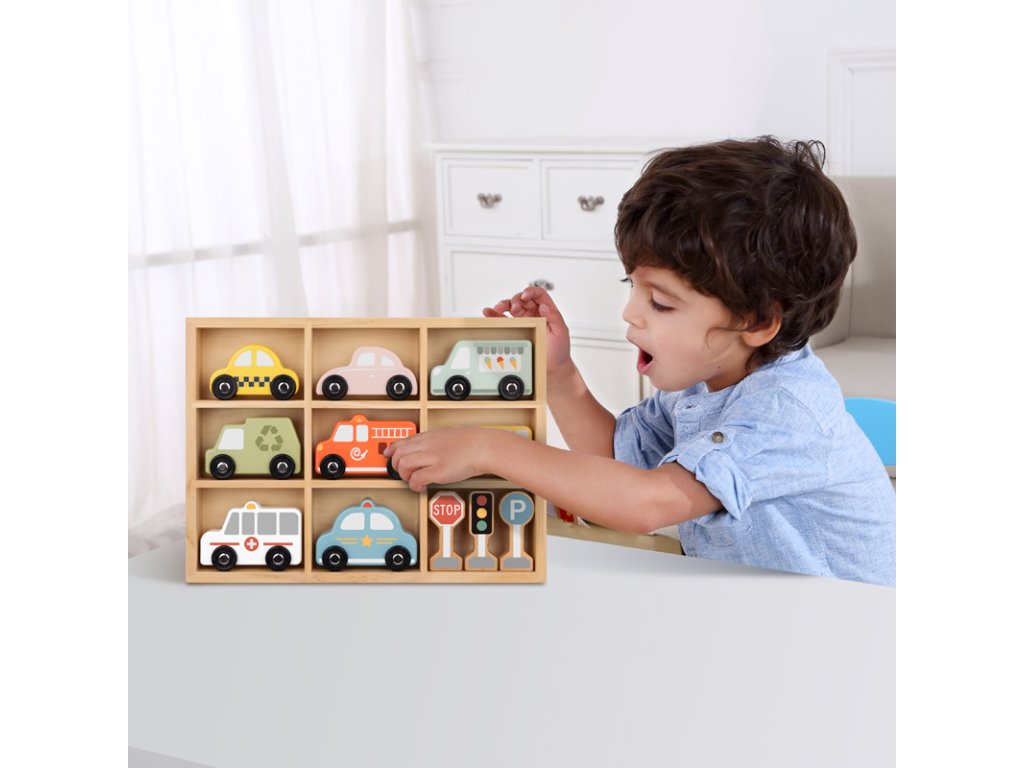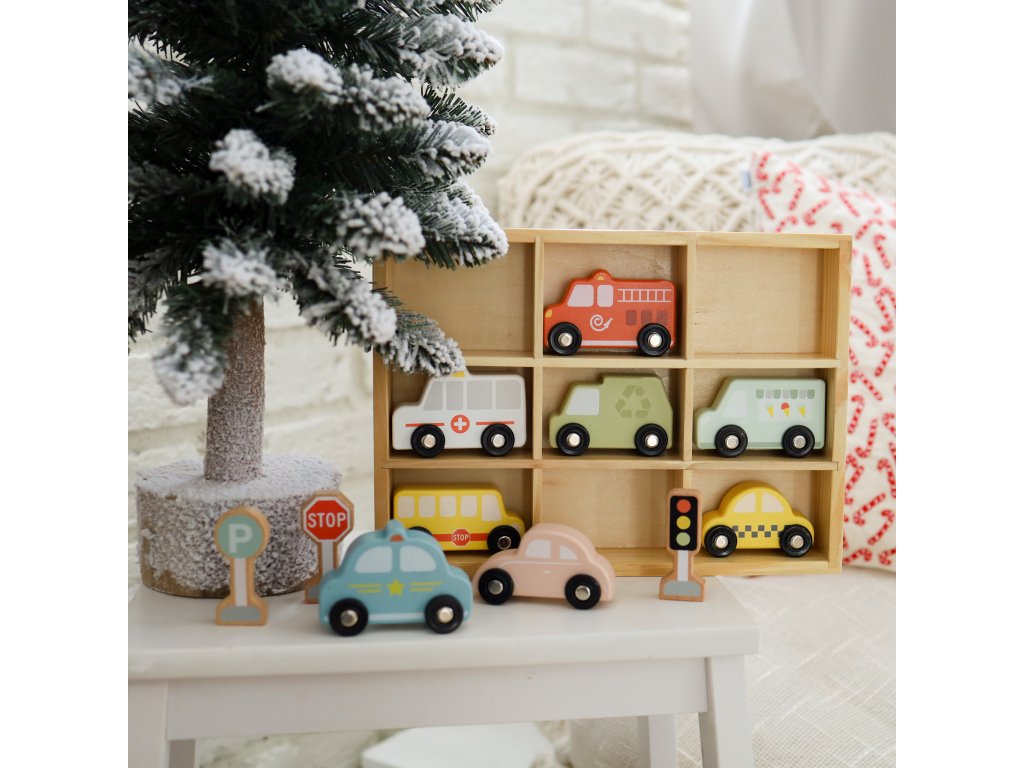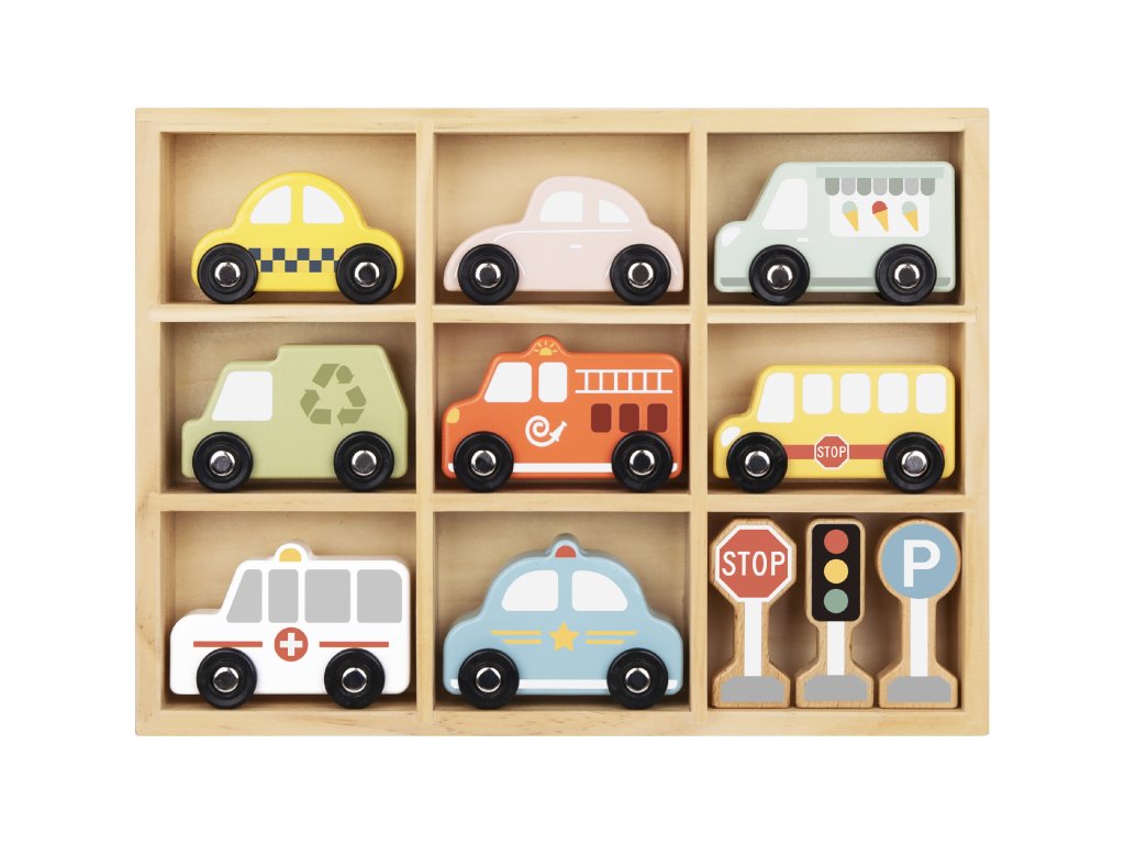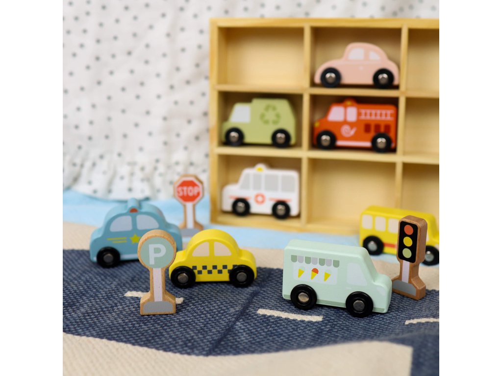 Dopravné prostriedky a značky Pastel 12 ks. Sada pre milovníkov autíčok. Drevená sada na hranie s dopravnými prostriedkami a dopravným značením od Tooky Toy deti zamestná na celé hodiny. Obsahuje 8 vozidiel (auto, taxi, sanitku, hasičské auto, smetiarske auto, školský autobus, zmrzlinárske auto a policajné auto), 3 dopravné značky a 1 vitrínku na hranie a vystavenie autíčok. Vozidlá sú tiež vhodné ako autíčka na vláčikodráhu!Herný set podporuje rozvoj detíDeti si počas hrania s autíčkami rozvíjajú jemnú motoriku, kreativitu, vymýšľajú vlastné príbehy, navrhujú vlastné scény. Pri hraní s viacerými deťmi si tiež rozvíjajú svoje komunikačné a sociálne schopnosti. Celá sada je vyrobená z dreva z udržateľného lesníctva. Farby sú netoxické. Značka Tooky Toy si dáva záležať na bezpečnosti, eco friendly výrobe a didaktickom rozmere svojich hračiek.