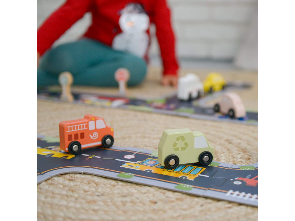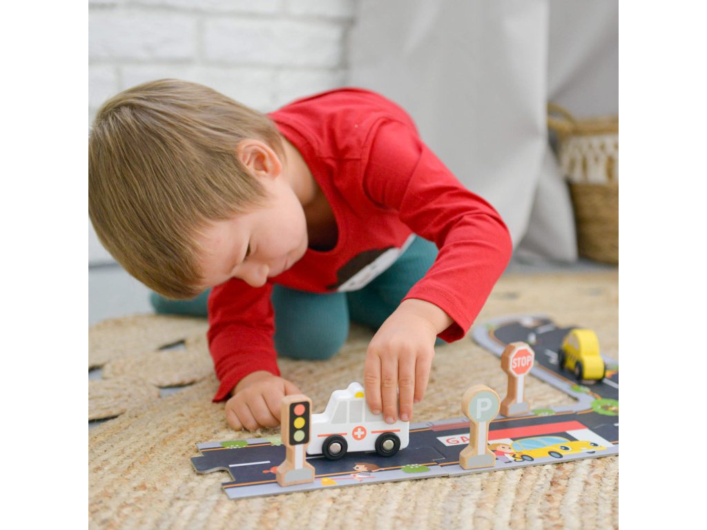 Drevená sada na hranie s dopravnými prostriedkami a dopravným značením od Tooky Toy poskytuje deťom hodiny zábavy a kreatívneho učenia.