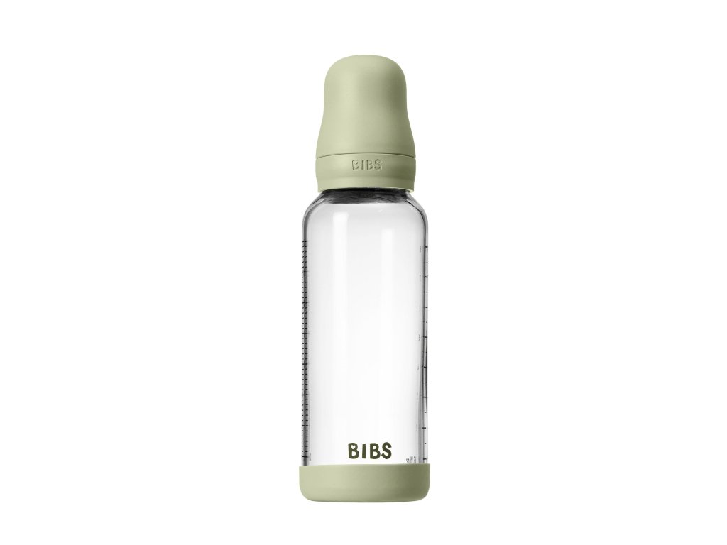 BIBS antikoliková dojčenská fľaša z borosilikátového skla s kaučukovým cumlíkom v tvare bradavky. V odtieni Sage, navrhnutá pre prirodzené satie a pohodlné kŕmenie bez kolík.