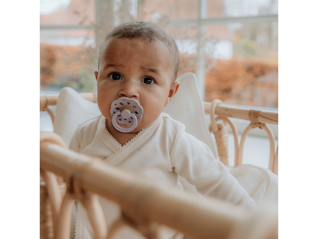 BIBS Boheme cumlík veľkosť 1 v odtieni Dusky Lilac. Vyrobený zo 100% prírodného kaučuku, s ikonickým bohémskym dizajnom a okrúhlym tvarom pre prirodzené sanie.