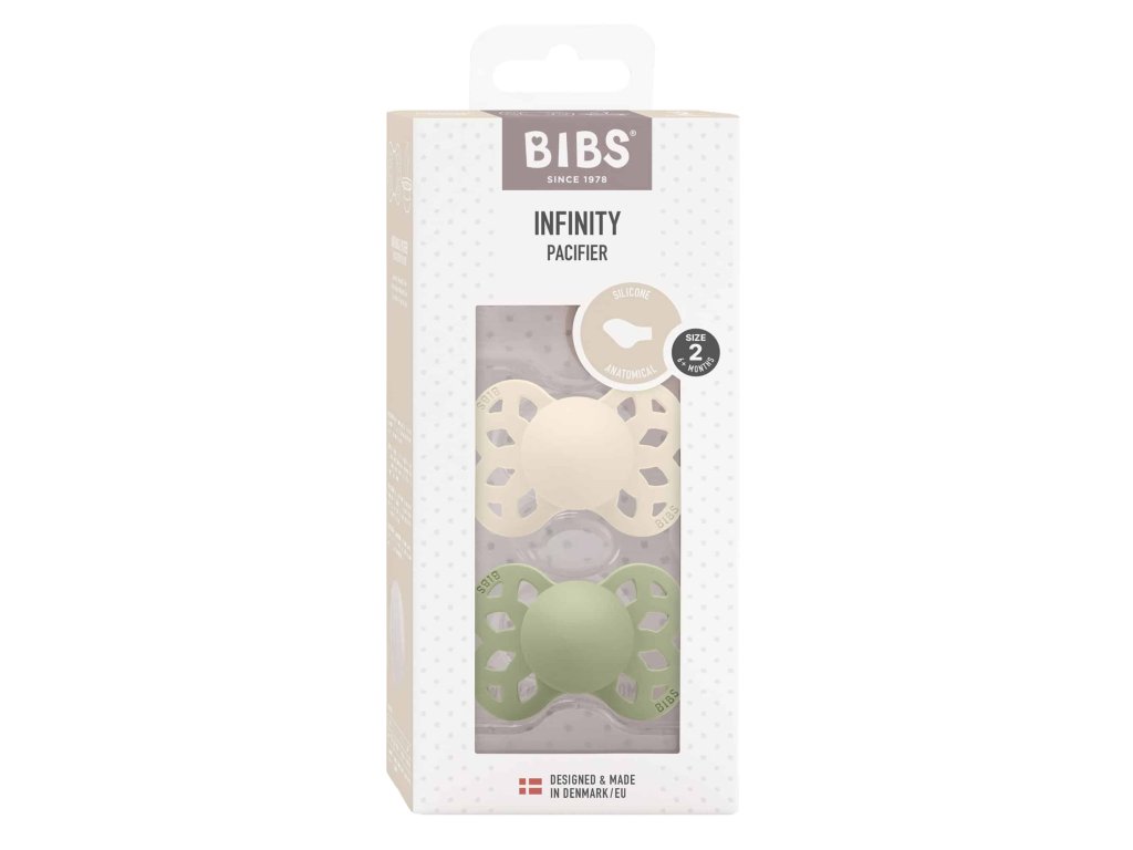 BIBS Infinity anatomické cumlíky zo silikónu 2ks – veľkosť 2 – Ivory / Sage Ortodontický tvar • 100% medicínsky silikón • Vyrobené v Dánsku