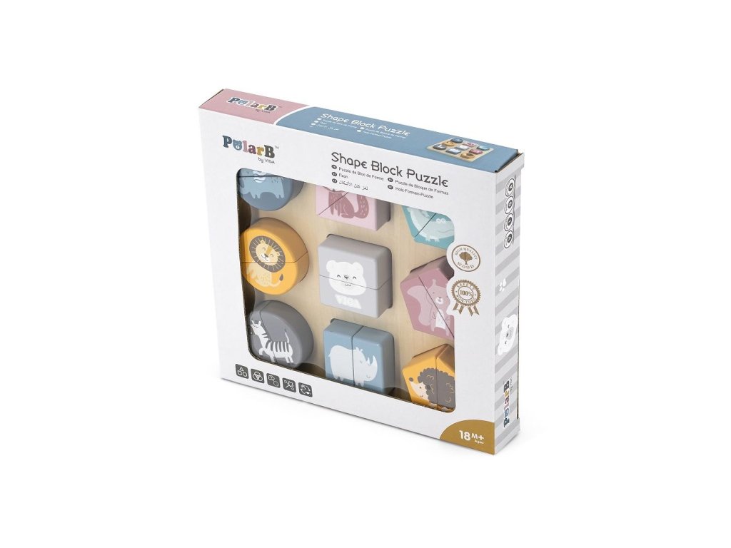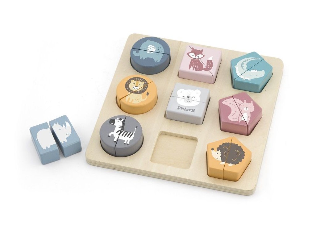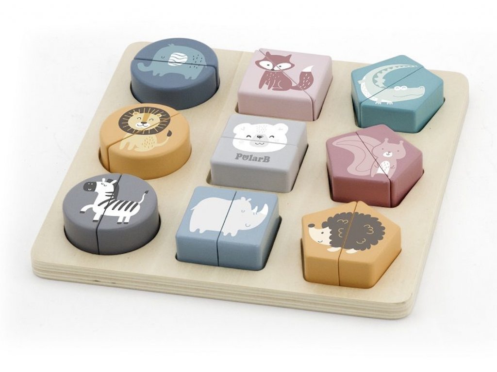 Súprava obsahuje 9 drevených zvieratiek a tri rôzne tvary puzzle podkladov. Rôzne úrovne náročnosti umožňujú postupný rozvoj a prispôsobenie podľa veku a schopností dieťaťa. Deti stimuluje k riešeniu úloh a rozpoznávaniu tvarov.