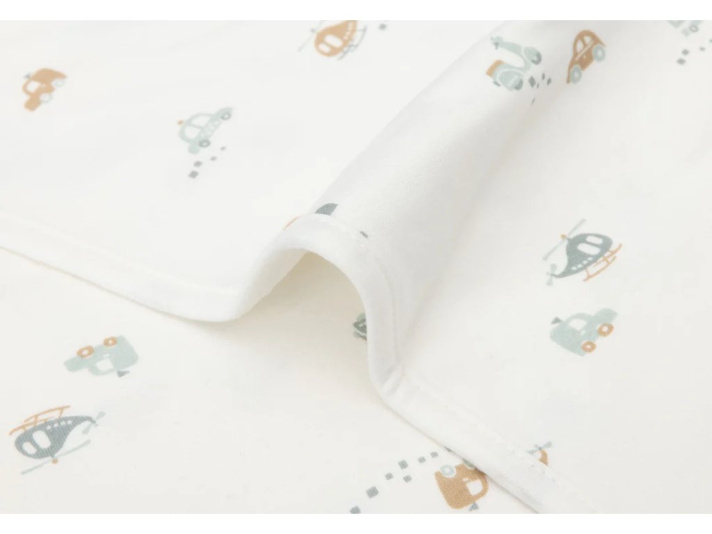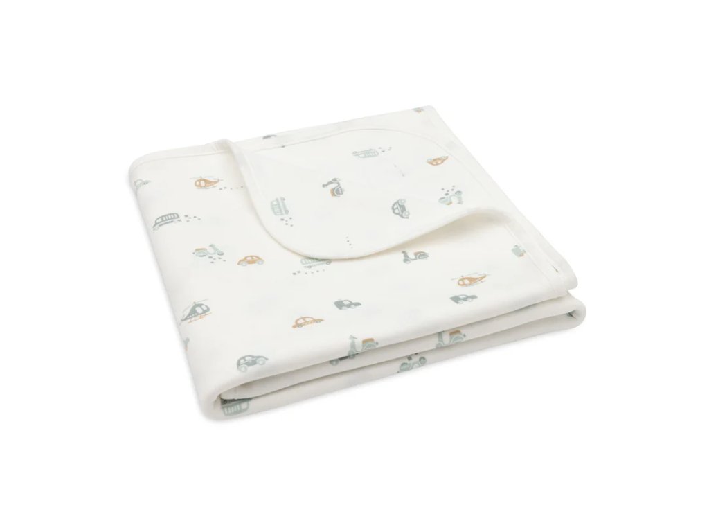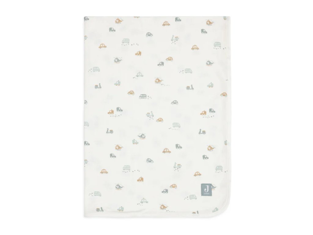 Ľahká a priedušná detská deka Jollein On The Go zo 100 % džerseju s motívmi áut, helikoptér a skútrov. Rozmer 75×100 cm, TOG 1,0 – ideálna do postieľky aj kočíka.