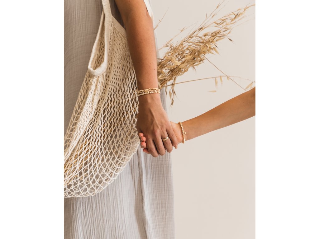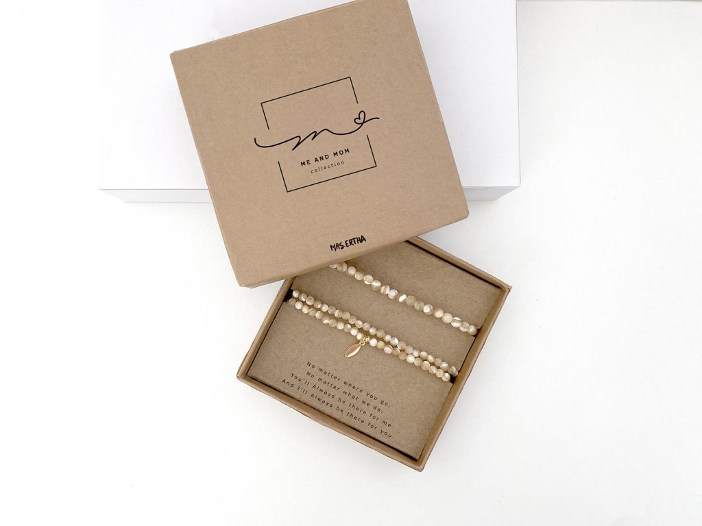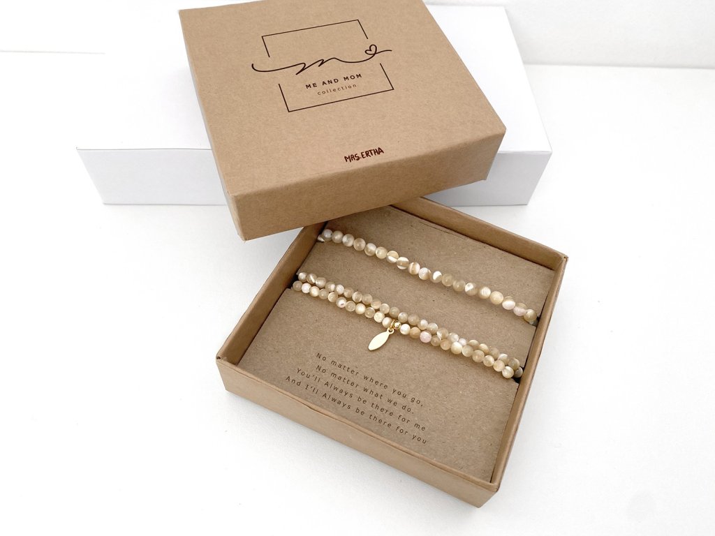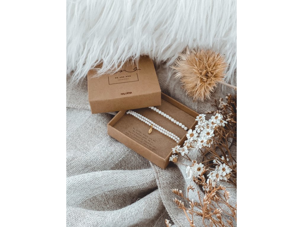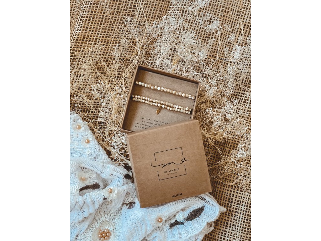 Sada dvoch náramkov pre mamu a dieťa ME&MOM z prírodného kameňa a ozdobami pozlatenými 24k zlatom. Tieto hodnotné a symbolické kúsky majú veľmi špeciálne poslanie vyzdvihnuť jedinečné puto matky a dieťaťa. Materiál: 100% prírodný kameň. 2 ks náramkov: väčší dvojradový pre dospelého a menší pre dieťa s obvodom 12 až 23 cm. Mamy a deti môžu odteraz nosiť rovnaký náramok a niesť spolu skutočne osobný odkaz: ” No matter where you go, No matter what we do. You’ll Always be there for me And I’ll Always be there for you» Materiál: 100% prírodný kameň Oba náramky sú jednoducho nastaviteľné. Menší náramok je nastaviteľný od 12cm do 23cm v obvode. Minimalistický darčekový obal v krabičke z recyklovaného kartónu. Starostlivosť: Ozdobné komponenty na náramkoch sú pozlátené 24 karátovým zlatom. Aby sa pozlátený povrch nepoškodil a vydržal čo najdlhšie, nevystavujte šperky vode ani žiadnym chemikáliám.