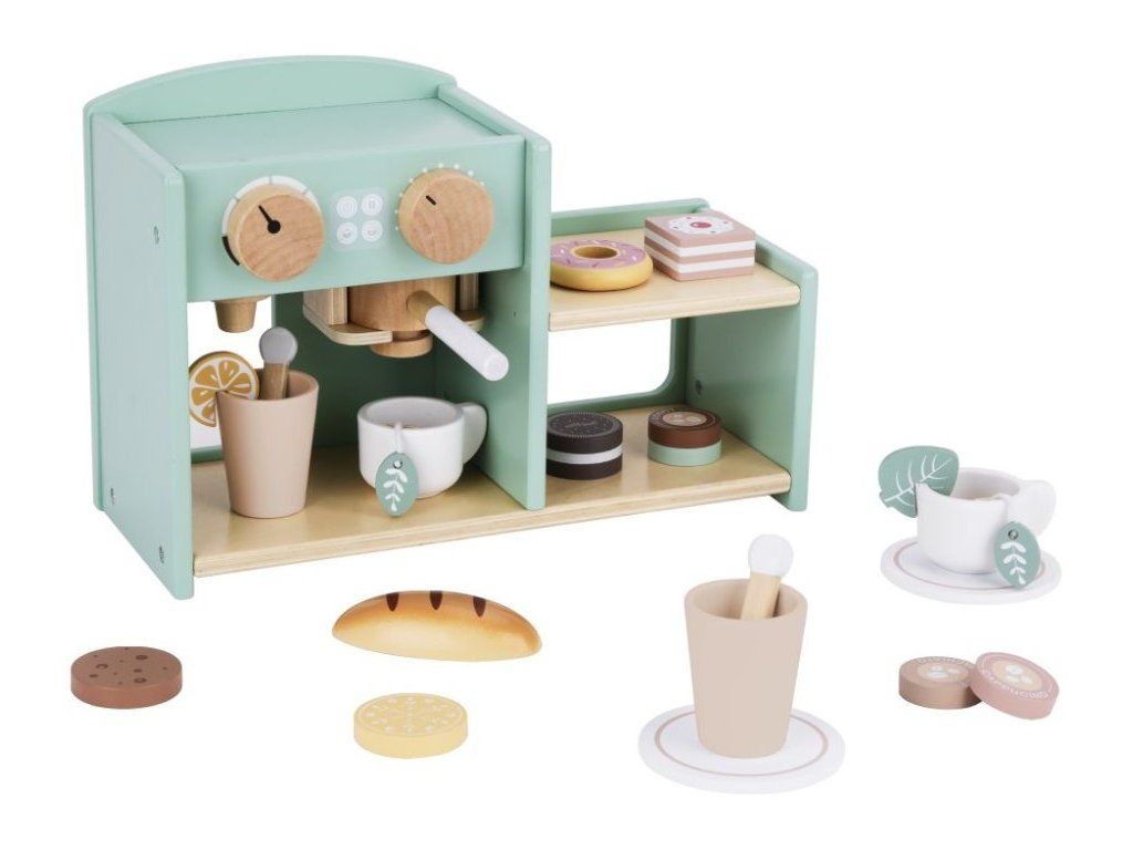 Táto drevená hračka spája dve obľúbené detské hry – prípravu kávy a hru na obchod.