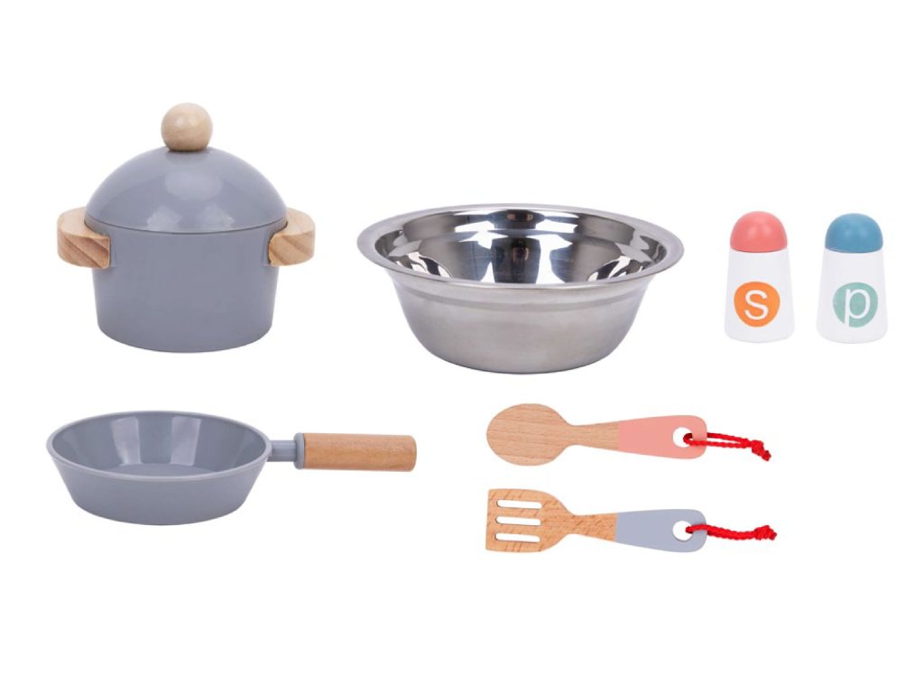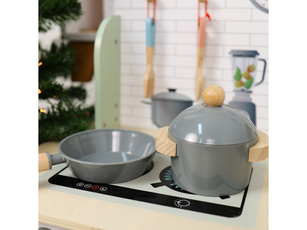 Kuchynka Pastel. Dokonalá kuchynka pre malých kuchárov. Neprehliadnuteľná detská kuchynka z dreva v pastelových farbách od Tooky Toy je skvelou hračkou na rolové hry na dospelých aj profesie. Drevená kuchynka sa stane jedinečným doplnkom detskej izbičky, podporí hru na kuchárov aj cukrárov. Okrem kuchynky v boxe nájdete ďalších 8 dielikov dreveného príslušenstva, ako sú hrnce a kuchynské potreby. Kuchynka má hodiny, rúru, kohútiky aj drez, aby hra deti ešte viac bavila.Deti si rozvíjajú sociálne zručnostiDetská kuchynka z dreva v pastelových farbách s príslušenstvom pomáha deťom vďaka hre na dospelých zlepšovať sa v sociálnych zručnostiach a komunikácii. Deti sú pri hre kreatívne a získavajú kladný vzťah k príprave a servírovaniu jedla. Drevené hračky pre deti Tooky Toy sú vyrobené z pevného, dobre opracovaného dreva z udržateľných zdrojov a sú natreté netoxickými farbami a lakom. Sada je skvelým narodeninovým darčekom pre deti.