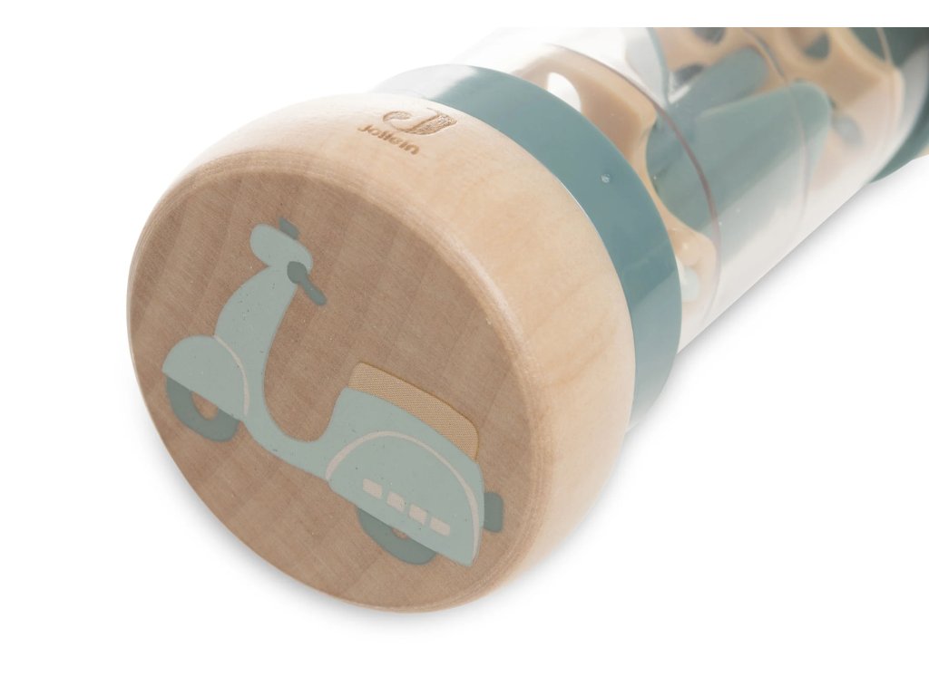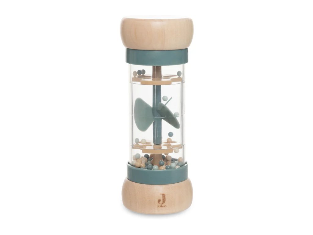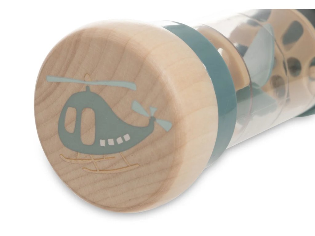 Drevená hrkálka Rainmaker – On The Go so priehľadnou trubicou, v ktorej cinkajú farebné guľôčky. Kompaktná, bezpečná a ideálna na cesty – poskytuje očarujúci zvuk dažďa a zmyslovú zábavu.