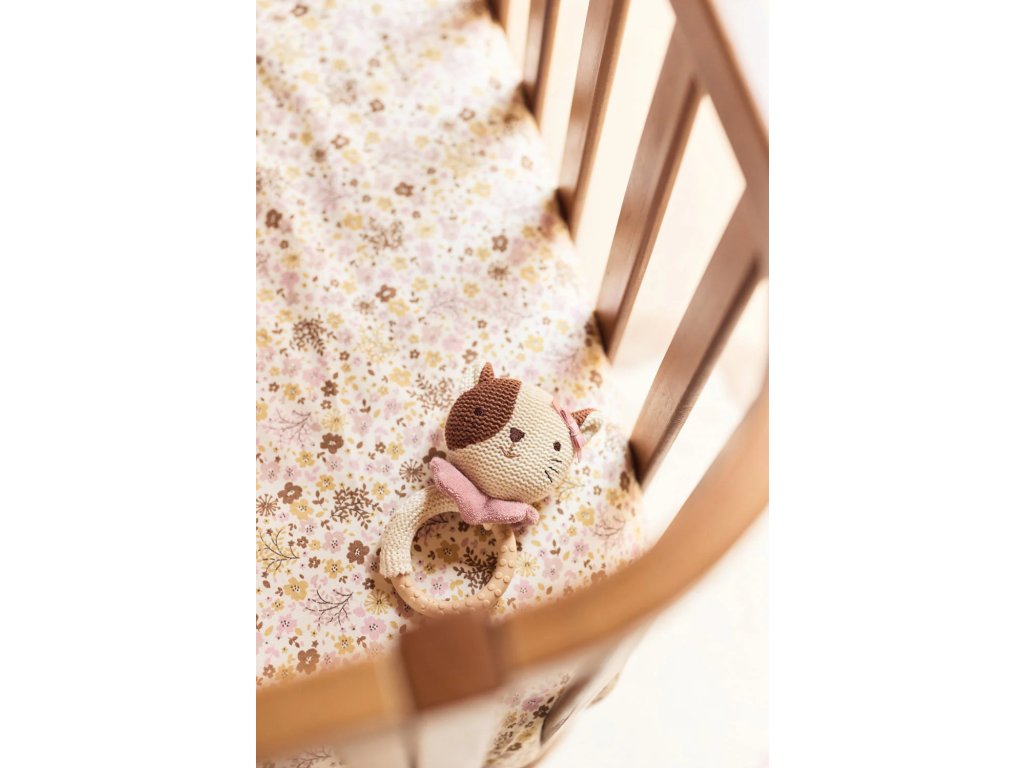 Hryzátko je vyrobené z kvalitného silikónu, ktorý je vhodný pre bábätká. Pletená hlavička mačky dodáva produktu hravý vzhľad a podporuje zmyslové vnímanie dieťaťa.