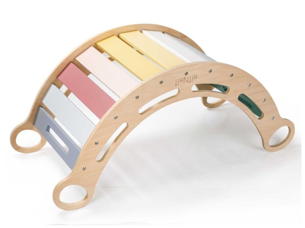 Drevená Montessori hojdačka pre deti 6v1 100 cm s doskou a stoličkou pastel balančná hojdačka, pohybová hra, rovnováha a lezenie