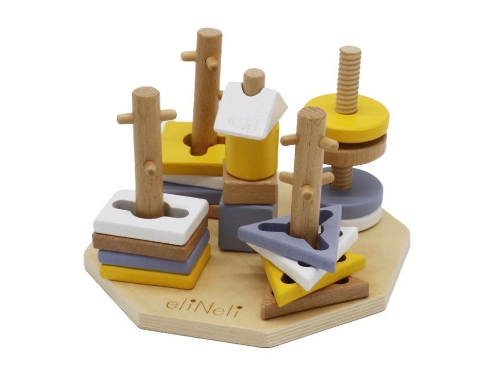 Manipulácia s drevenými dielikmi pomáha rozvíjať koordináciu ruka oko a presnosť pohybov. Dieťa si zlepšuje úchop a kontrolu nad pohybom.