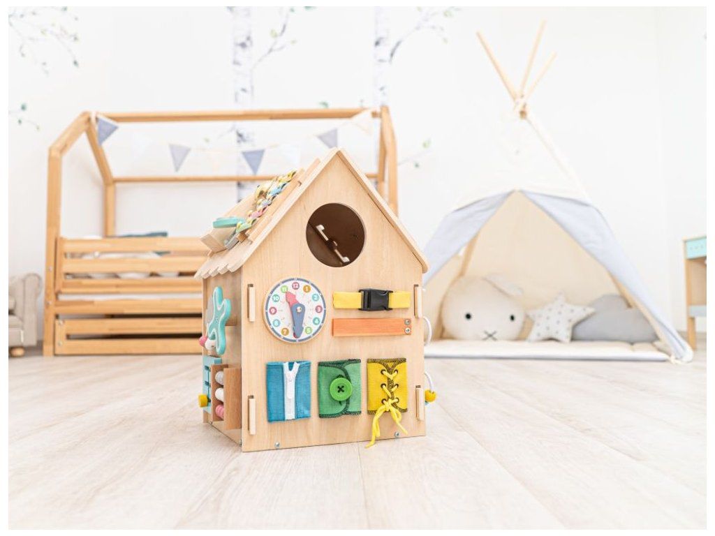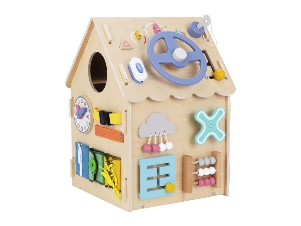 Táto drevená manipulačná doska v tvare domčeka ponúka deťom množstvo aktivít, ktoré ich prirodzene zaujmú.