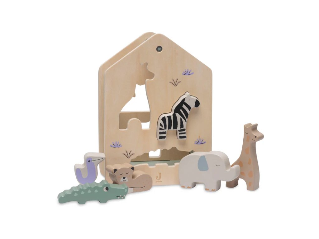 ✨ Spojte všetky zvieratká z džungle! Tento drevený domček na vkladanie tvarov z kolekcie Jungle Jambo pomáha deťom rozvíjať jemnú motoriku, logické myslenie a koordináciu ruka-oko.