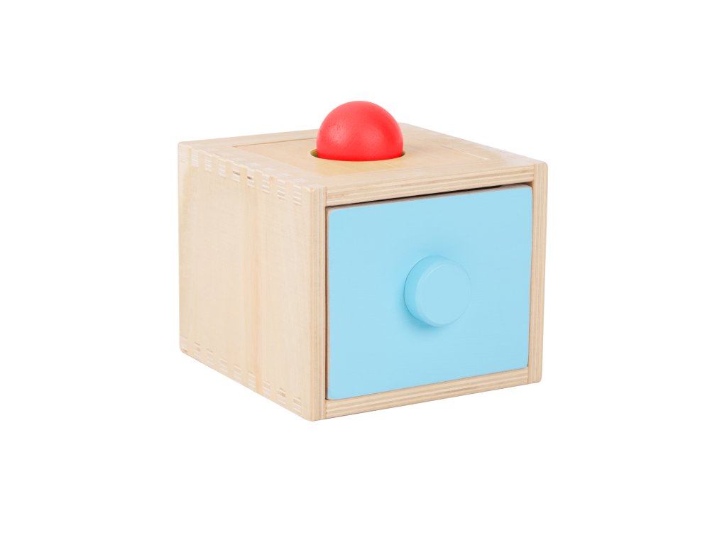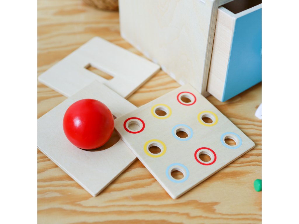 Dieťa sa učí trafiť guľôčku do otvoru a sleduje jej pád do zásuvky – tréning koordinácie a sústredenia.