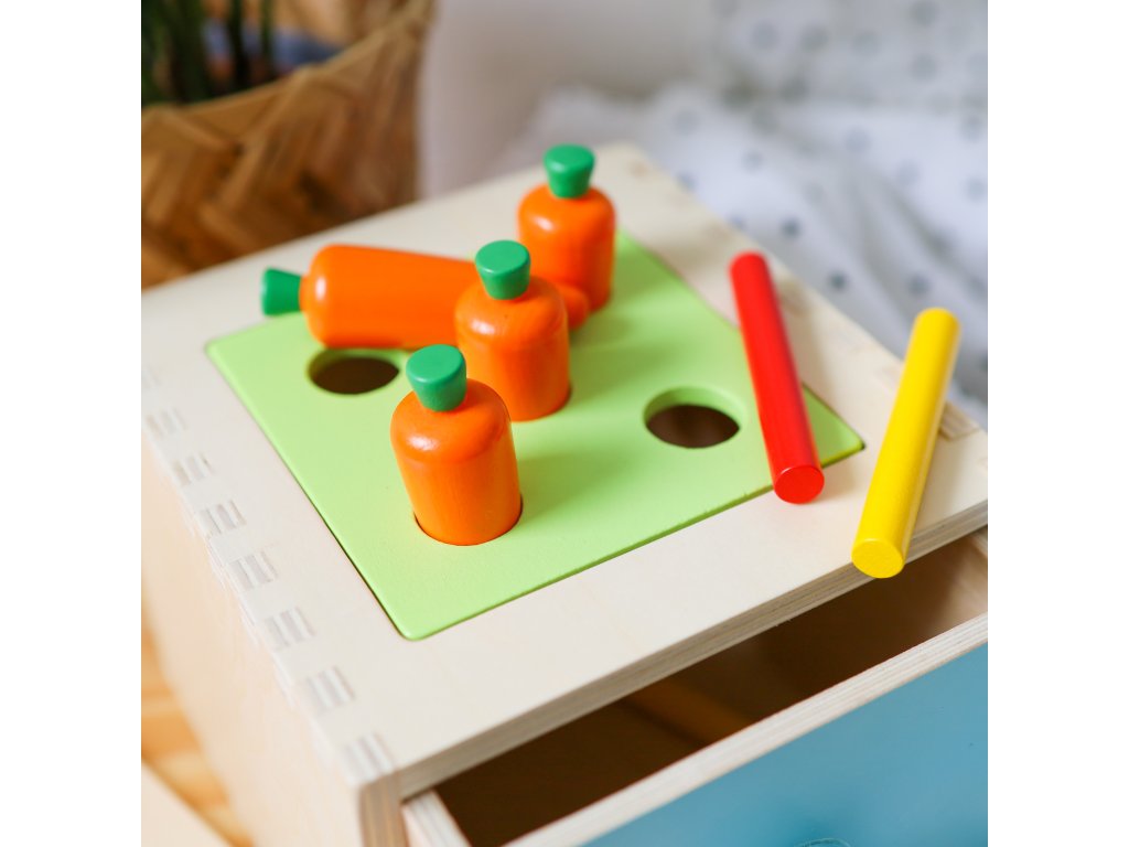 Najskôr dieťa vkladá paličky do ktoréhokoľvek otvoru, neskôr sa učí triediť podľa farby, čím rozvíja logické myslenie a koncentráciu.