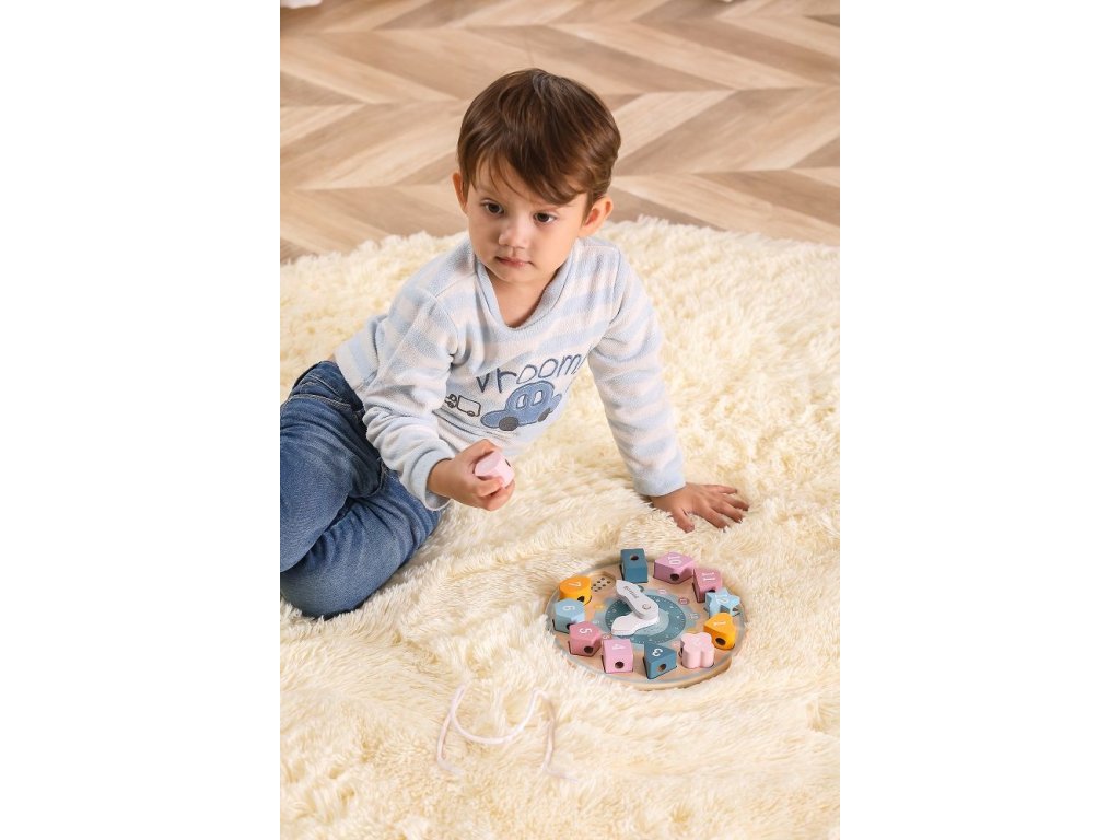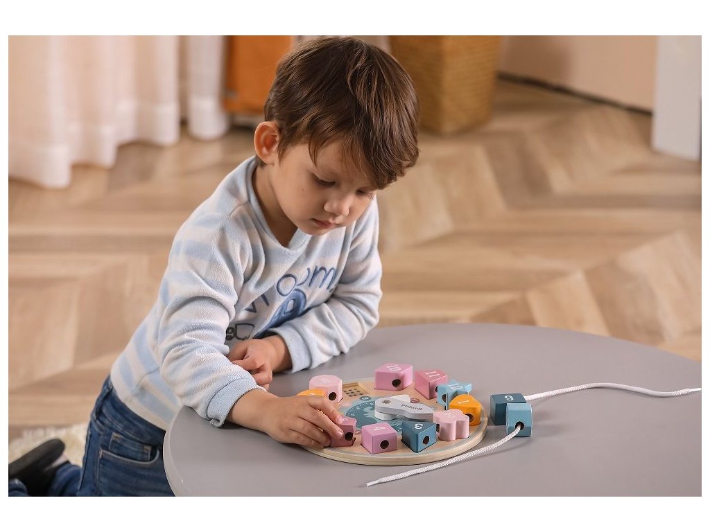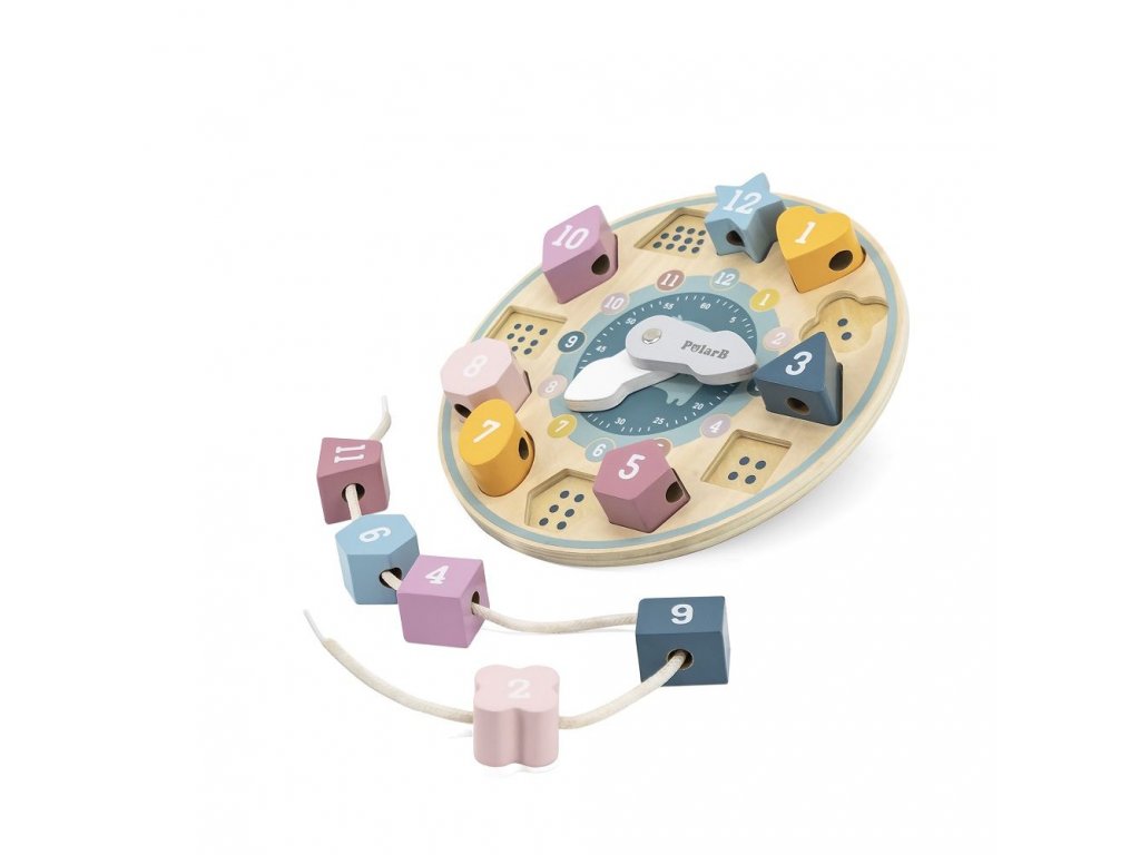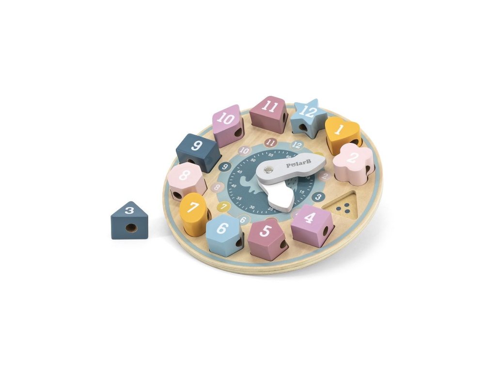 Drevené hodiny so slonom zo série PolarB kombinujú tri aktivity v jednej hračke. Dieťa sa pomocou pohyblivých ručičiek učí poznať čas, vkladá tvary podľa čísel na ciferníku a môže ich navliekať na priloženú šnúrku. Pri hre si cvičí jemnú motoriku, logické myslenie aj sústredenie.