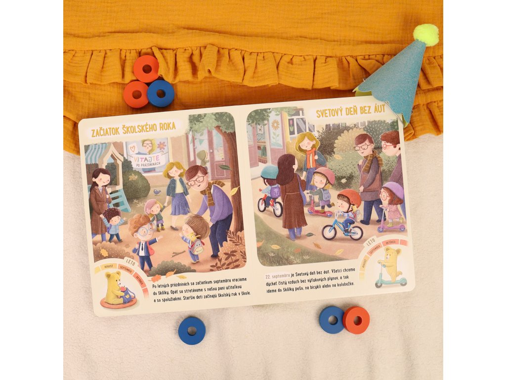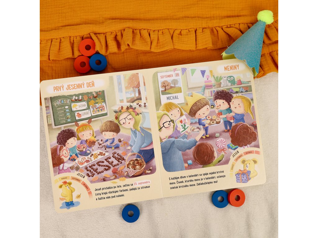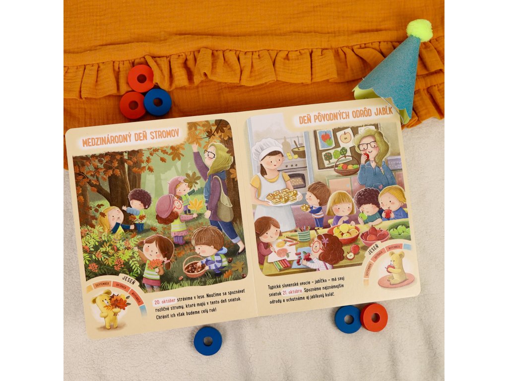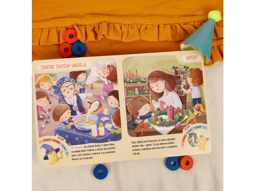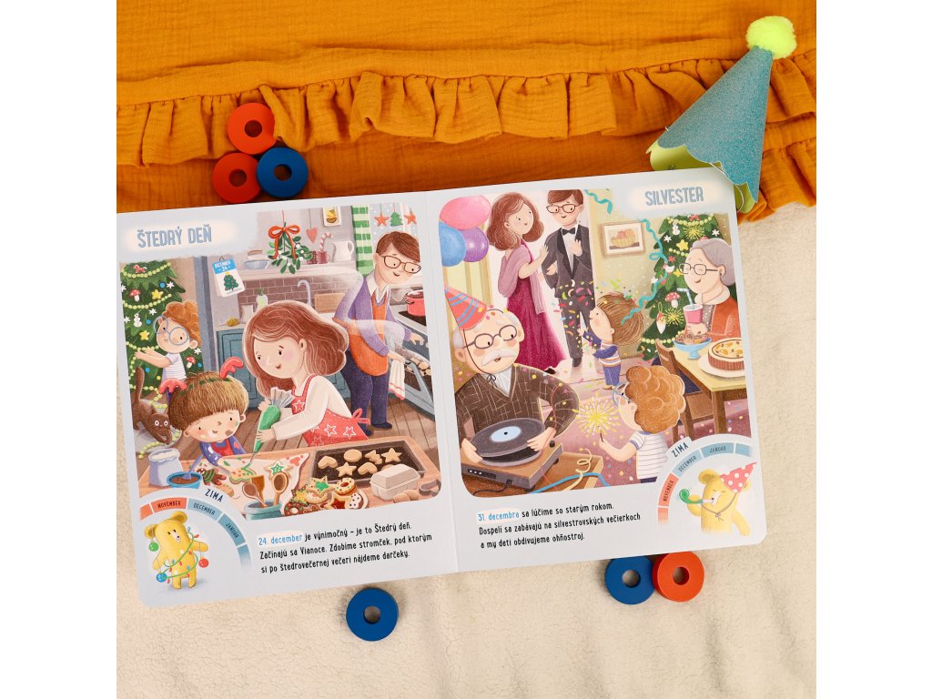 Miško a Brumko oslavujúAké ročné obdobia poznáme? V akom poradí po sebe nasledujú jednotlivé mesiace? A kedy oslavujeme rozličné sviatky?Dieťa sa to všetko učí vďaka pozorovaniu zmien, ktoré sa dejú v prírode. A pomáha mu aj to, že si počas roka pripomíname všelijaké výnimočné udalosti a slávime rozličné sviatky. Predškolák Miško a Brumko pomôžu deťom uvedomiť si plynutie času prostredníctvom sviatkov v roku.Preto sa tentoraz Miško a jeho nerozlučný kamarát – plyšový macko Brumko – zúčastnia na rôznych oslavách a významných príležitostiach, či už sú to sviatky štátne (napríklad Deň vzniku Slovenskej republiky), náboženské (Vianoce a Veľká noc) alebo rodinné (narodeniny, meniny), a oslávia ich doma so svojimi najbližšími, alebo si ich pripomenú v škôlke so spolužiakmi. Fragment kolieska z hodín v rohu každej stránky zobrazuje ročné obdobie a názov mesiaca, na ktorý konkrétna udalosť pripadá.