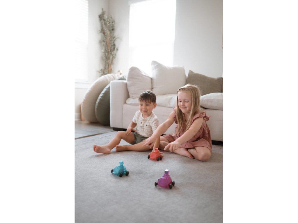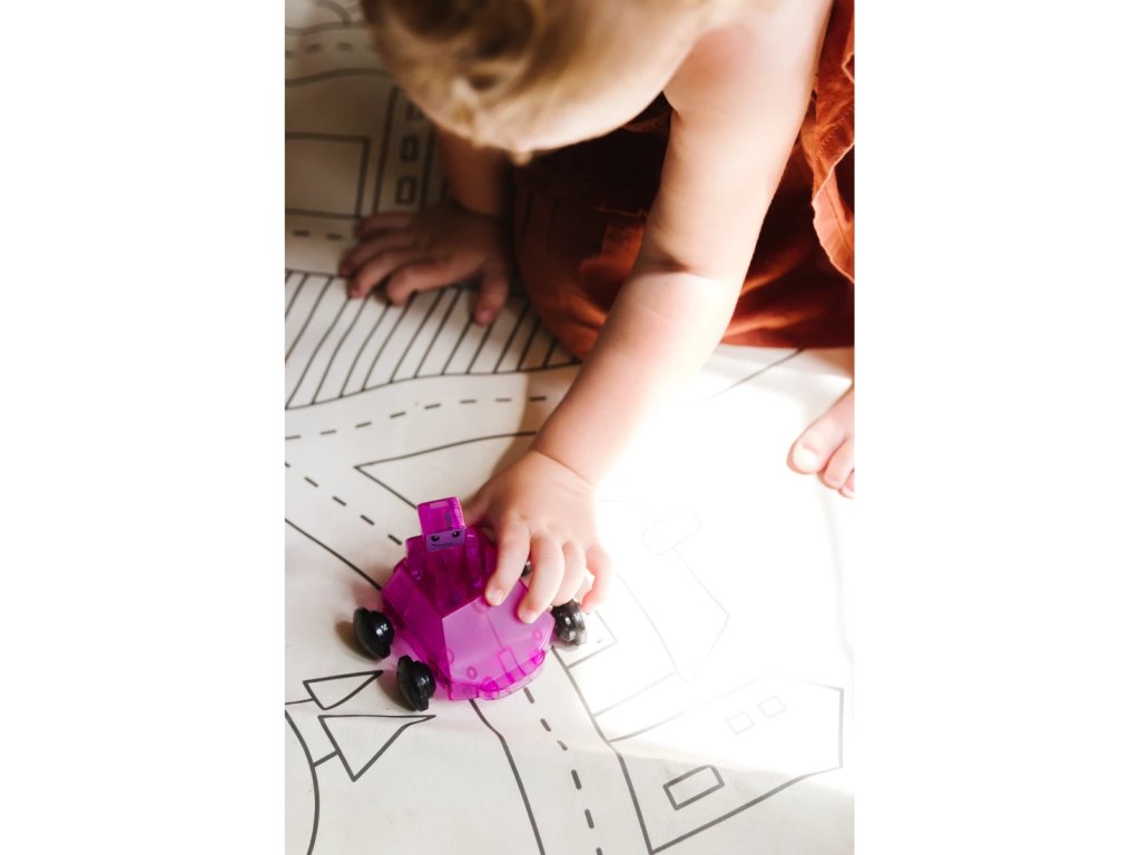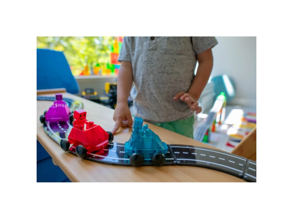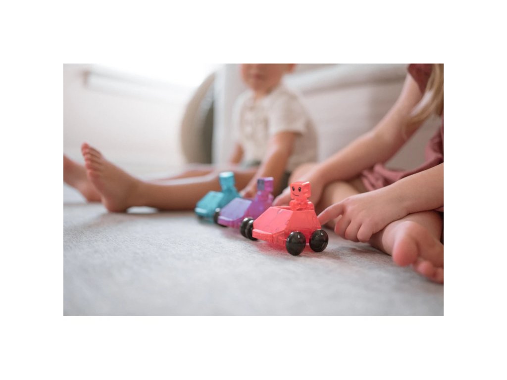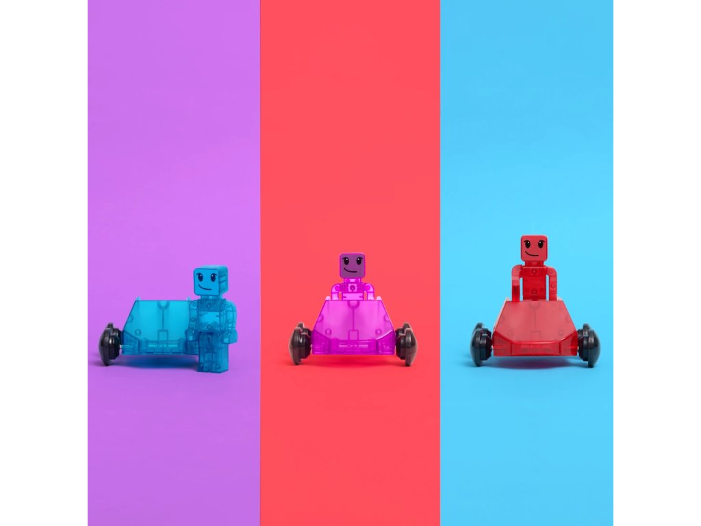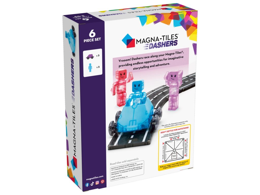Tieto jedinečné Dashery, prvé plne magnetické figúrky a vozidlá, sú navrhnuté tak, aby jazdili po tradičných štvorcových dlaždiciach, ako aj po rampách a cestách. Ich kolesá jazdia na vonkajšej strane dlaždíc a malá brzda na spodnej strane reguluje rýchlosť. Figúrky obsahujú magnety na rukách, nohách a hlave, a preto sú aj s vozidlami plne kompatibilné so všetkými sadami Magna-Tiles®.Zmysluplná stavebnica pre malých staviteľovMagna-Tiles je zástancom zmysluplnej hry, to znamená zábavnej a pútavej, no zároveň založenej na rozvíjaní detských zručností. Táto stavebnica podporuje rozvoj koordinácie ruka-oko, jemnej motoriky a logického myslenia prostredníctvom skúmania príčin a následkov. Bezpečnosť a špičková kvalita sú zaistené použitím potravinárskeho, netoxického plastu MABS bez BPA, ftalátov a latexu. Pevná konštrukcia dielikov praskaniu a udržiavanie magnety bezpečne na svojom mieste.Sada obsahuje 6 dielov:3x vozidlo – červené, modré a fialové,3x figúrka – červená, modrá a fialová.