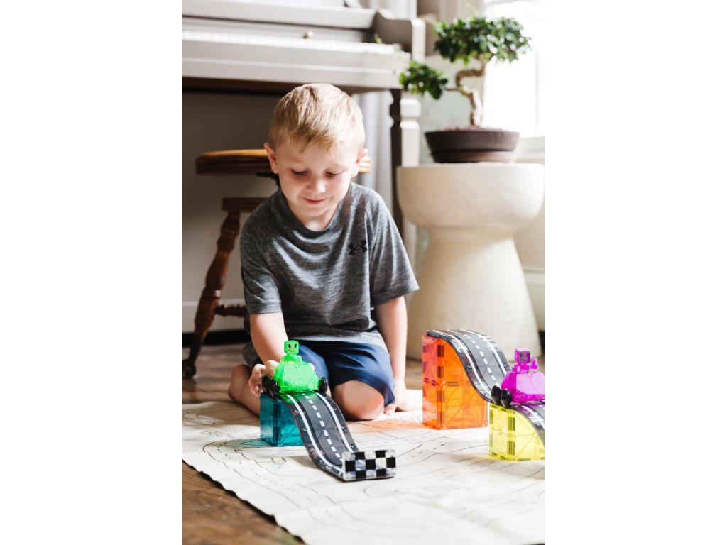 je ideálna pre malých pretekárov. Deti môžu stavať rampy a pretekať s dvomi magnetickými autíčkami a jazdcami. Súprava je kompatibilná so všetkými ostatnými Magna-Tiles stavebnicami, podporuje rozvoj motorických zručností, koordinácie ruka-oko a kreativity. Vyrobená z bezpečného, netoxického plastu bez BPA a ftalátov. Sada obsahuje 40 dielov vrátane ramp, autíčok a figúrok.