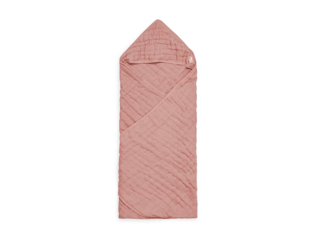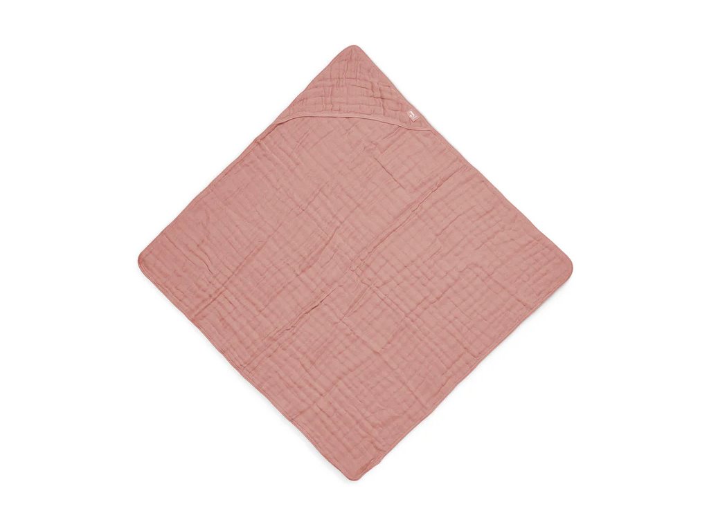 Mäkká mušelínová osuška Jollein Rosewood 75×75 cm zo 100 % bavlny. Rýchlo schne, skvelo absorbuje a kapucňa udrží hlavičku dieťaťa v teple.
