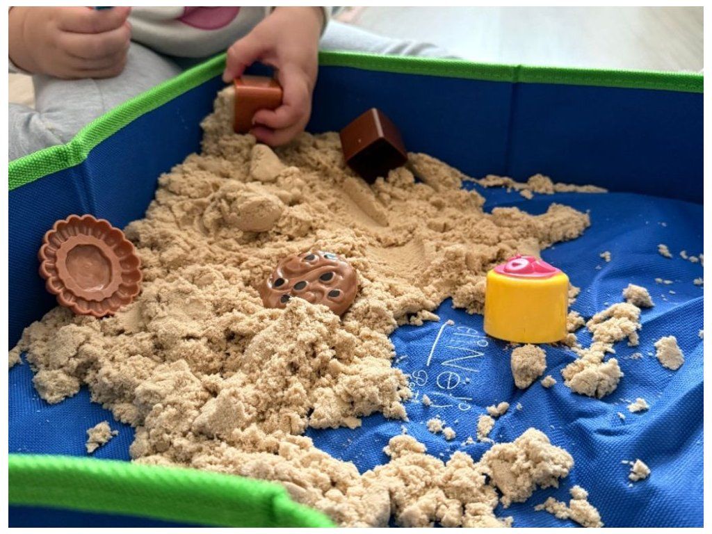 Kinetický piesok s pieskoviskom a formičkami – kreatívna sada nekonečné tvarovanie | senzorická hra | jemná motorika