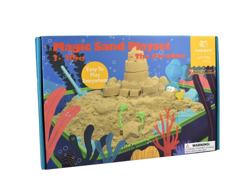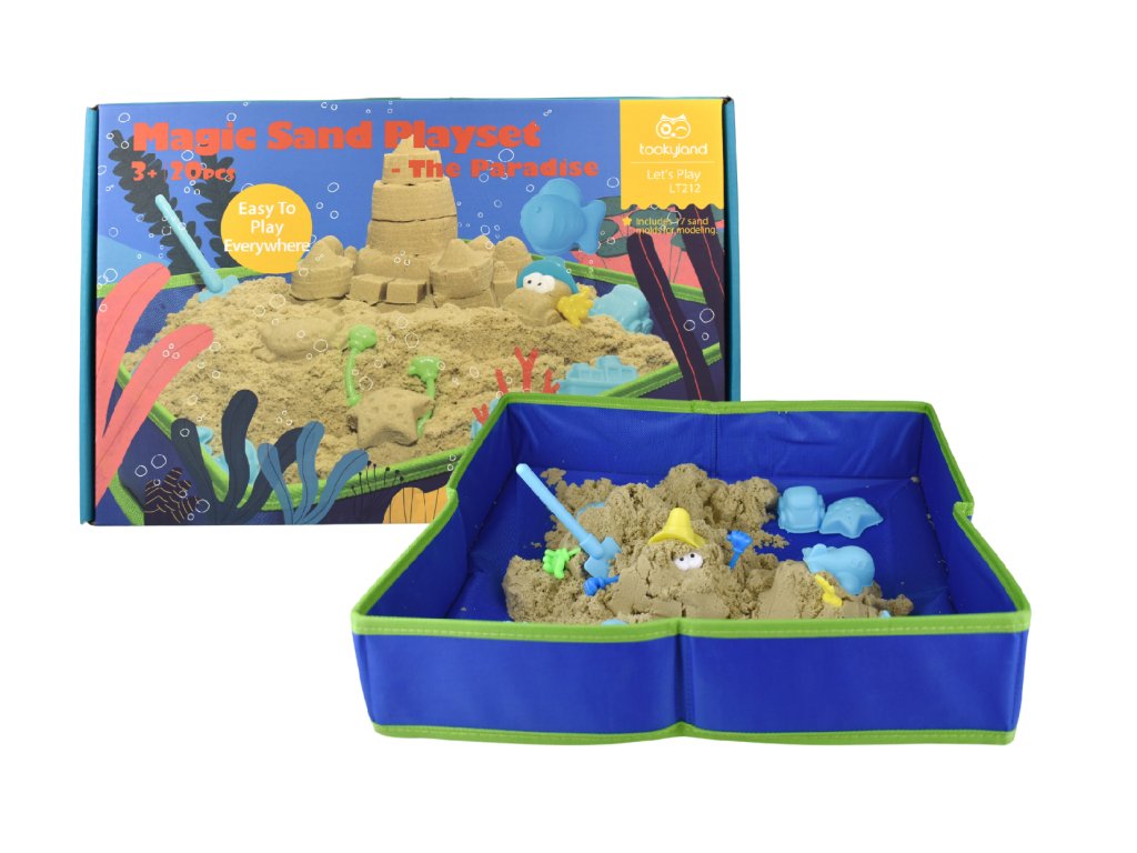 Kinetický piesok Veľká sada More 20 ks. Pieskovisko u vás doma! Aj keď vonku prší, vaše deti sa môžu hrať v piesku. Veľká kinetická súprava do piesku s formičkami a podložkou od spoločnosti Tookyland poskytne vašim deťom dostatok priestoru na hru v piesku u vás doma. Súčasťou balenia sú 2 vrecia kinetického piesku s hmotnosťou 1 kg, 1 skladacia kinetická podložka do piesku (390 x 390 mm) a 17 formičiek a ďalšie príslušenstvo s motívom podmorského života a dopravných prostriedkov. Piesok je veľmi jemný, krásne drží tvar a nikdy nevysychá. Nepriťahuje prach a nespôsobuje alergie.Skvelá súprava na zmyslovú hruDeti si pri hre s kinetickým pieskom rozvíjajú svoju kreativitu, koncentráciu a hmatové zručnosti. Hra s pieskom ich zároveň upokojuje. Piesok je vyrobený z najjemnejšieho plážového piesku. Kreatívne potreby pre deti Tookyland sú vysoko kvalitné a bezpečné. Súprava je skvelým darčekom pre deti!