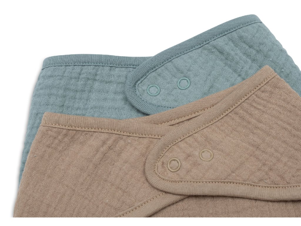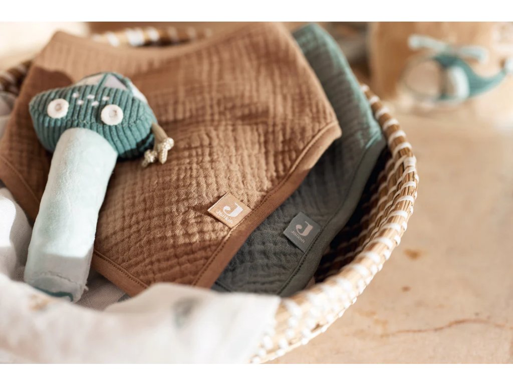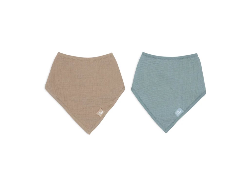 Mušelínové bandana podbradníky Jollein v odtieňoch Sea Green a Biscuit. Jemné, priedušné, savé a nastaviteľné. Praktické balenie 2 ks pre bábätká.