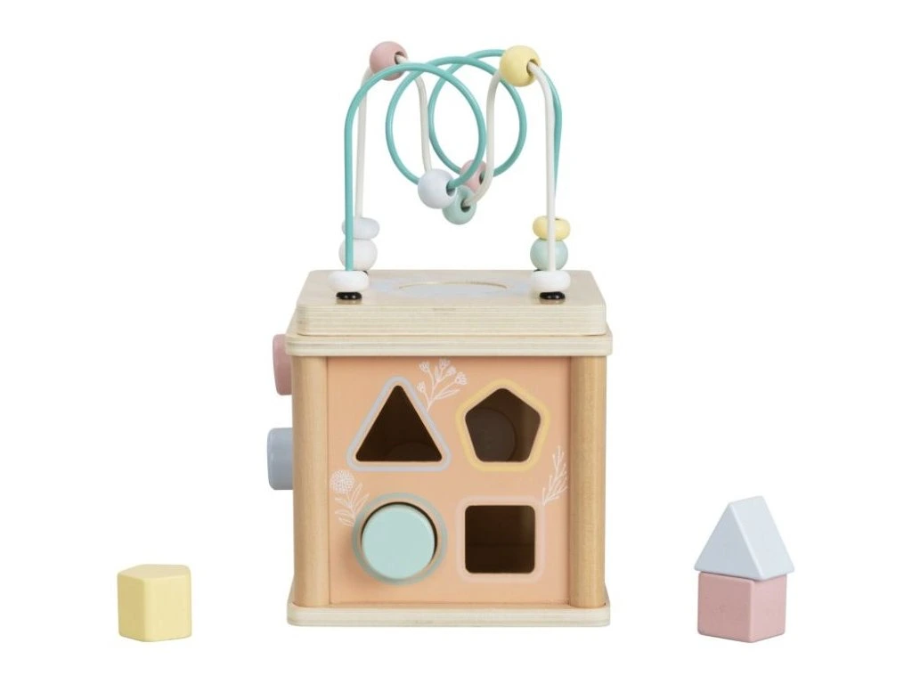 Kocka ponúka rôzne typy hier – vkladačku tvarov, ozubené kolieska, otáčacie prvky aj bludisko. Vrchná časť obsahuje motorické slučky s korálkami, ktoré rozvíjajú pohyb rúk a koordináciu.