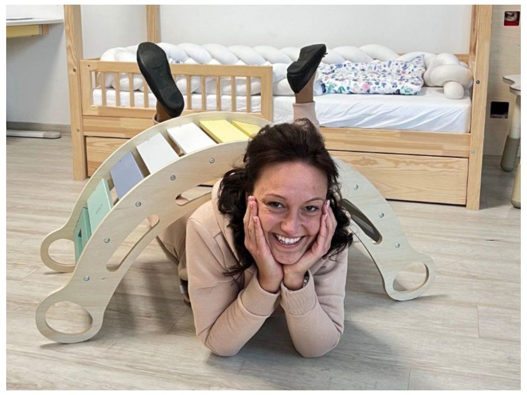 Táto drevená hojdačka patrí medzi obľúbené Montessori pomôcky, ktoré podporujú prirodzený pohyb detí. Vďaka svojmu tvaru a pevnej konštrukcii ponúka široké možnosti využitia a deti ju využívajú každý deň iným spôsobom.
