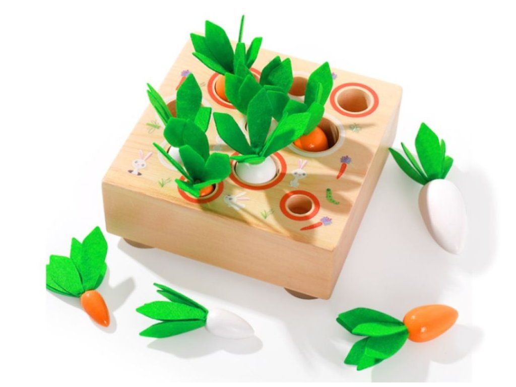 Drevená vkladačka mrkvičky je jednoduchá a zároveň veľmi zábavná hračka, pri ktorej deti vkladajú mrkvičky do správnych otvorov podľa veľkosti.