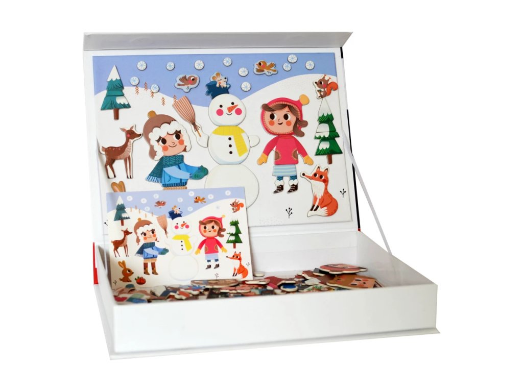 Čo máte deti na zime najradšej? Stavanie snehuliaka, guľovačku s kamarátmi, čakanie na Mikuláša, či ozdobovanie stromčeka? Vyberte si zo 4 predlohových kartičiek a postavte si podľa nej z magnetiek svoju obľúbenú zimnú, či vianočnú činnosť. Kto má chuť, môže vyskúšať poobliekať postavičky aj do rôznych zimných oblečení.