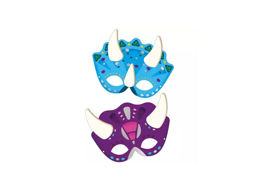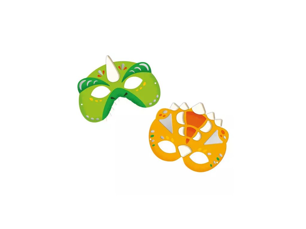 Toto nádherné balenie obsahuje 4 masky dinosaurov na dozdobenie, 16 bielych penových nálepiek na vytvorenie rohov, zobákov či zdobených golierov a 50 strieborných nálepiek na vytvorenie svojej vlastnej masky dinosaura.