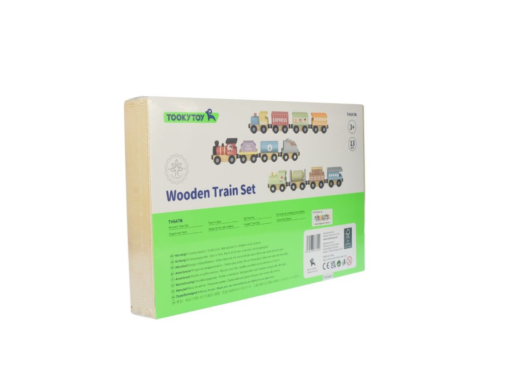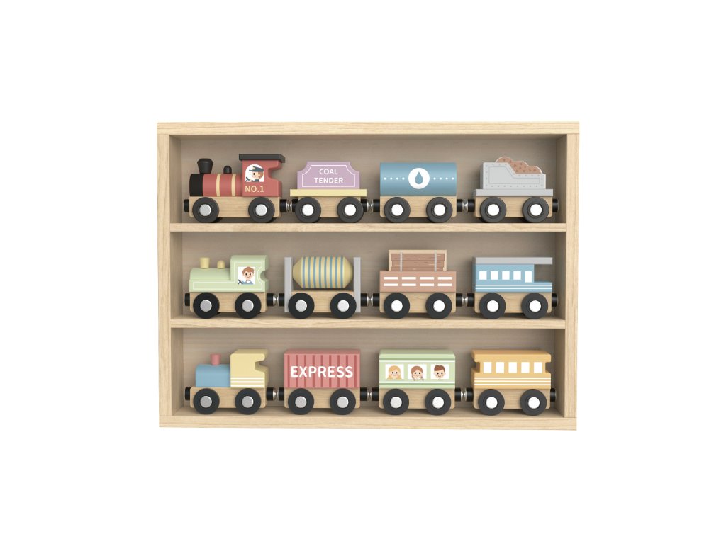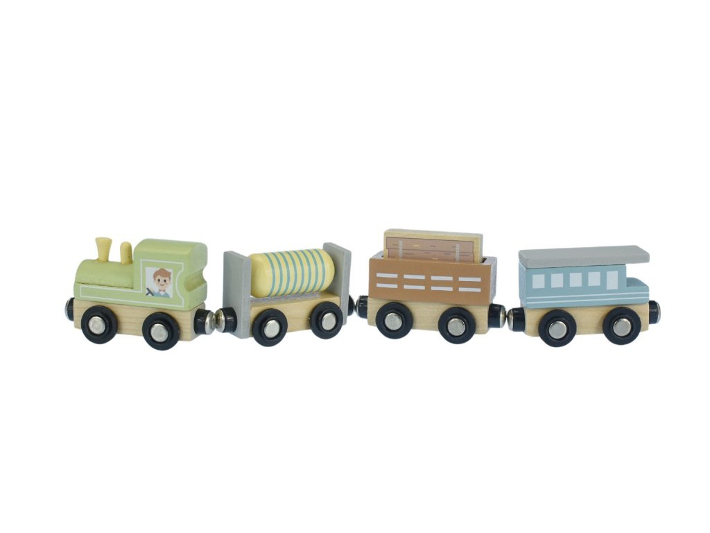 Sada obsahuje 12 drevených vláčikov v pastelových farbách, vrátane 3 drevených mašinek a 9 rôznorodých osobných aj dopravných vagónov. Všetky sú navrhnuté na jednoduché spojenie pomocou magnetov.