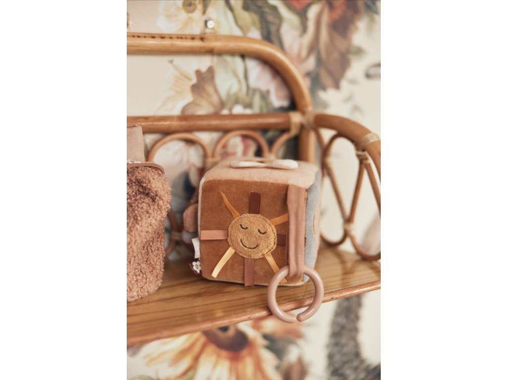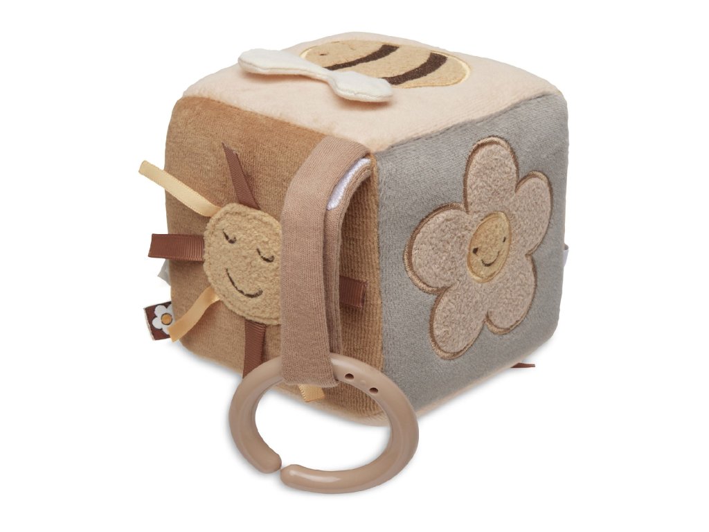 K tomu, kocka obsahuje šnúrku s plastovým krúžkom, ktorý umožňuje ľahké pripevnenie kocky na ohrádku, kočík alebo iné miesto. To znamená, že môžete túto zábavnú hračku vziať so sebou kamkoľvek, či už ste doma alebo na cestách. Potlač kocky zobrazuje rozkošné motívy ako kvietok, kačičku, včielku a lienku, ktoré stimulujú zvedavosť dieťaťa a podporujú jeho objavovateľské schopnosti.