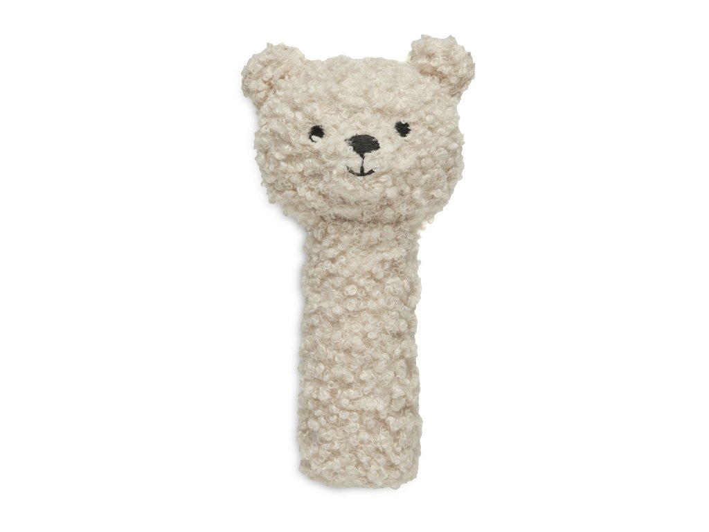 Super užitočný materiál na cvičenie. V hlavičke medvedíka je zvonček, ktorý jemne zazvoní, keď vaše bábätko pohne hrkálkou. Veľmi zaujímavé pre vaše dieťa . A vďaka super mäkkej verzii je možné sa s medvedíkom po hraní aj len tak túliť. Viac sladkých medvedíkov? Objavte všetky naše položky z kolekcie Teddy Bear! Hrkálka je dostupná vo farbách listová zelená, sušienka a natural. Hrkálka je vysoká 19 cm. Časť, ktorú vaše dieťa drží, má 8 cm. Zvieratko je vyrobené z bouclé 100% polyesteru. Tak super mäkké! Výplň tvorí výplň zo 100% polyesterového vlákna. Vo zvieratku je kovový zvonček.