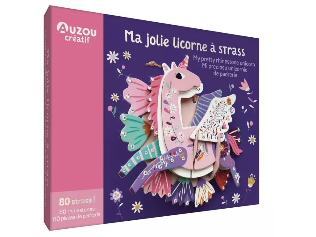 Sada na výrobu jednorožca so štrasovými kamienkami. Sada obsahuje krásne zdobené diadémy z tvrdeného kartónu veľkosti 20x20 cm, 80 trblietavých kamienkov na nalepenie a šnúrku na zavesenie trojrozmernej dekorácie. Odporúčaný vek: 6+