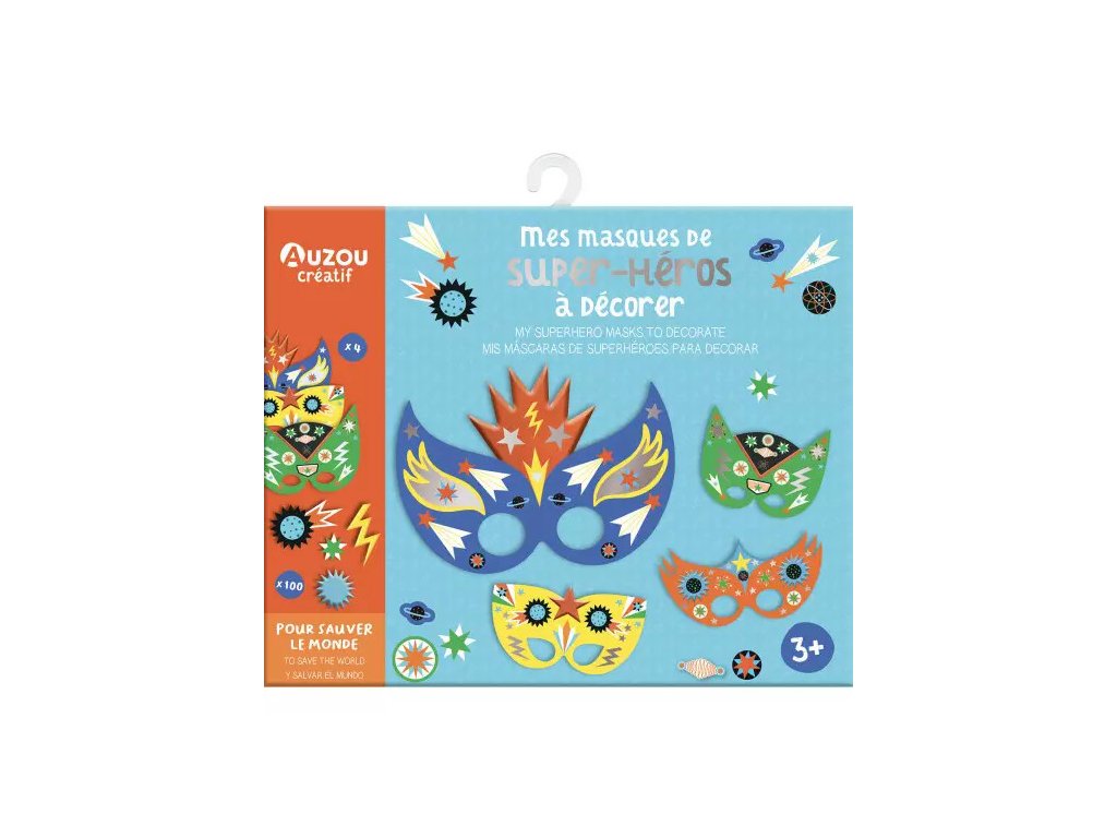 Súčasťou balenia je 100 farebných štýlových samolepiek (penové, strieborné, so vzormi) a 4 gumičky na upevnenie masiek okolo hlavy. Odporúčaný vek: 3+