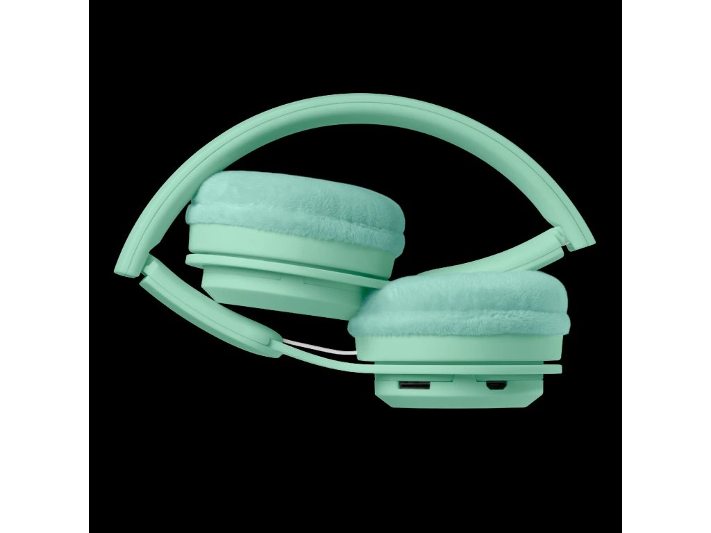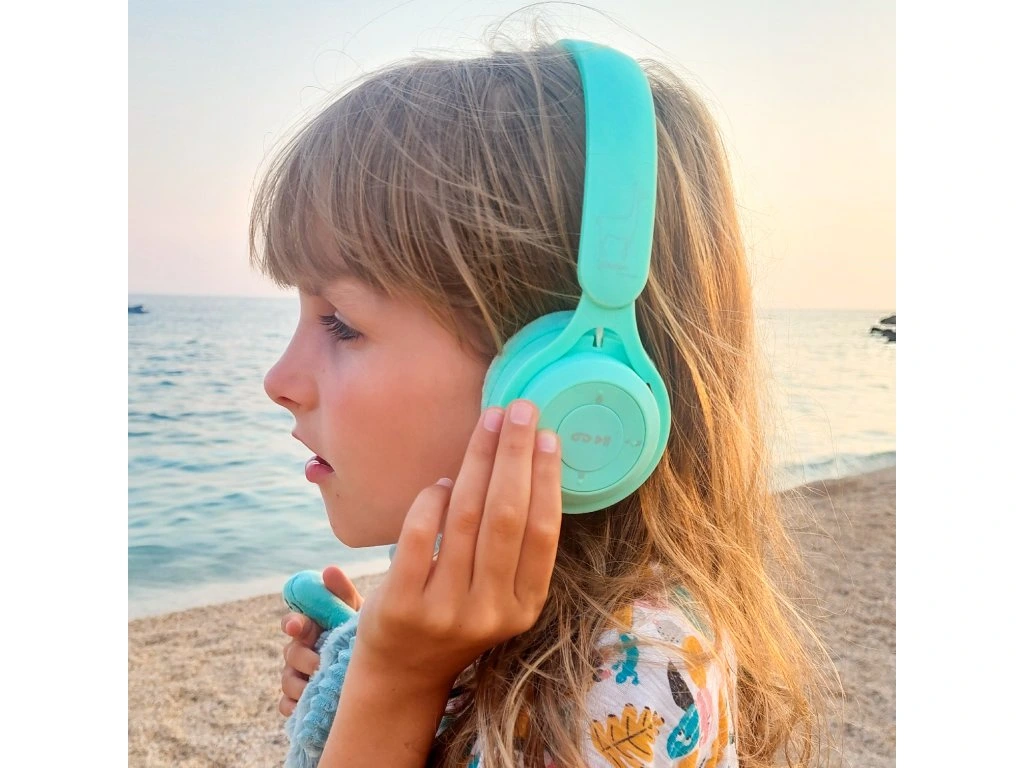 Bezdrôtové detské slúchadlá Pastel Mint s obmedzením hlasitosti 85 dB chránia detský sluch a ponúkajú čistý zvuk doma aj na cestách.