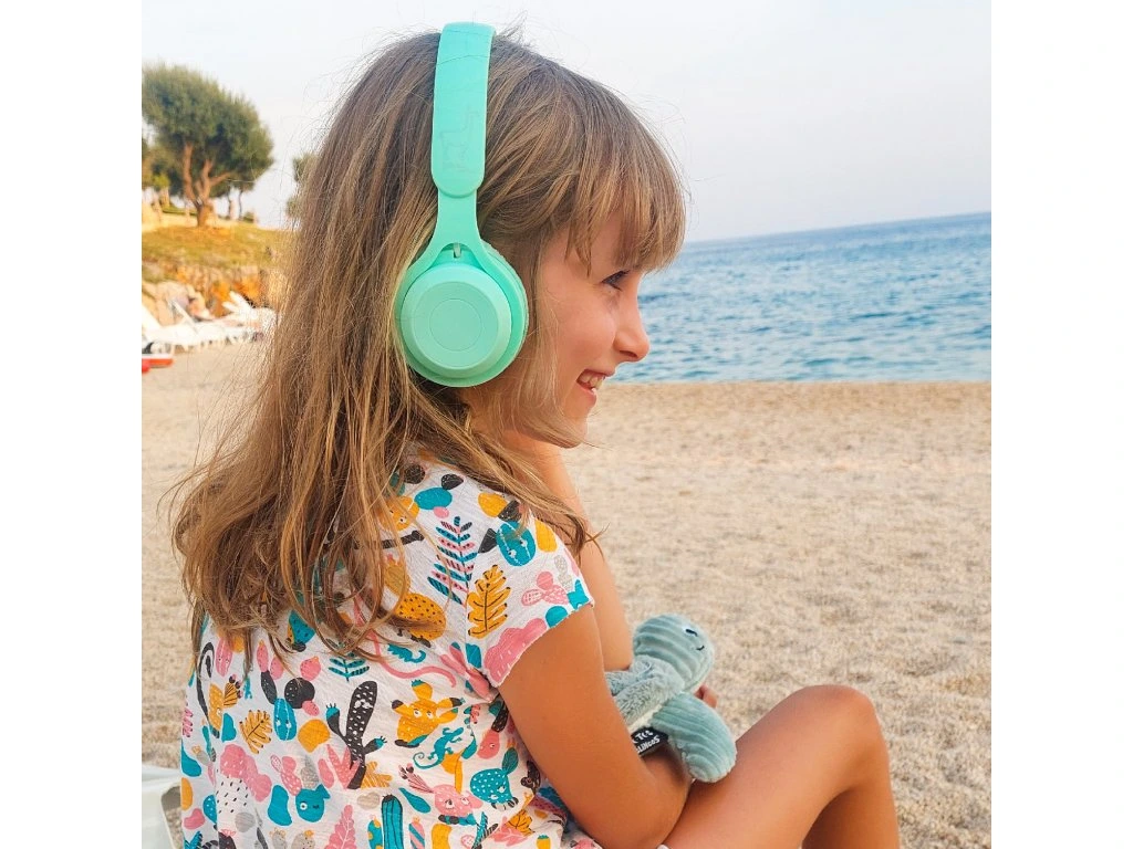 Bezdrôtové detské slúchadlá Pastel Mint sú navrhnuté pre pohodlie a bezpečnosť detí. Mäkký gumový povrch zabezpečuje príjemné nosenie aj počas dlhších ciest autom, lietadlom či vlakom.